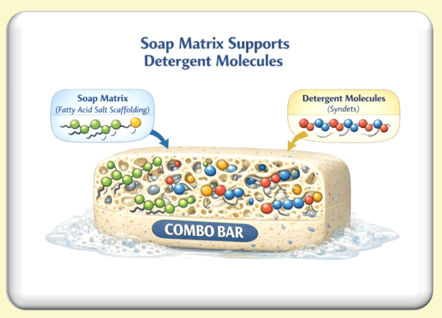 Combo bars exist because soap and synthetic detergents solve different problems—and neither can fully replace the other on its own. Soap naturally forms a rigid, self-supporting crystalline matrix that gives a bar its shape, hardness, and controlled wear. Synthetic detergents, while highly versatile and effective cleansers, lack this inherent structure and must either be carried by soap or mechanically engineered into shape using binders and extrusion systems.
