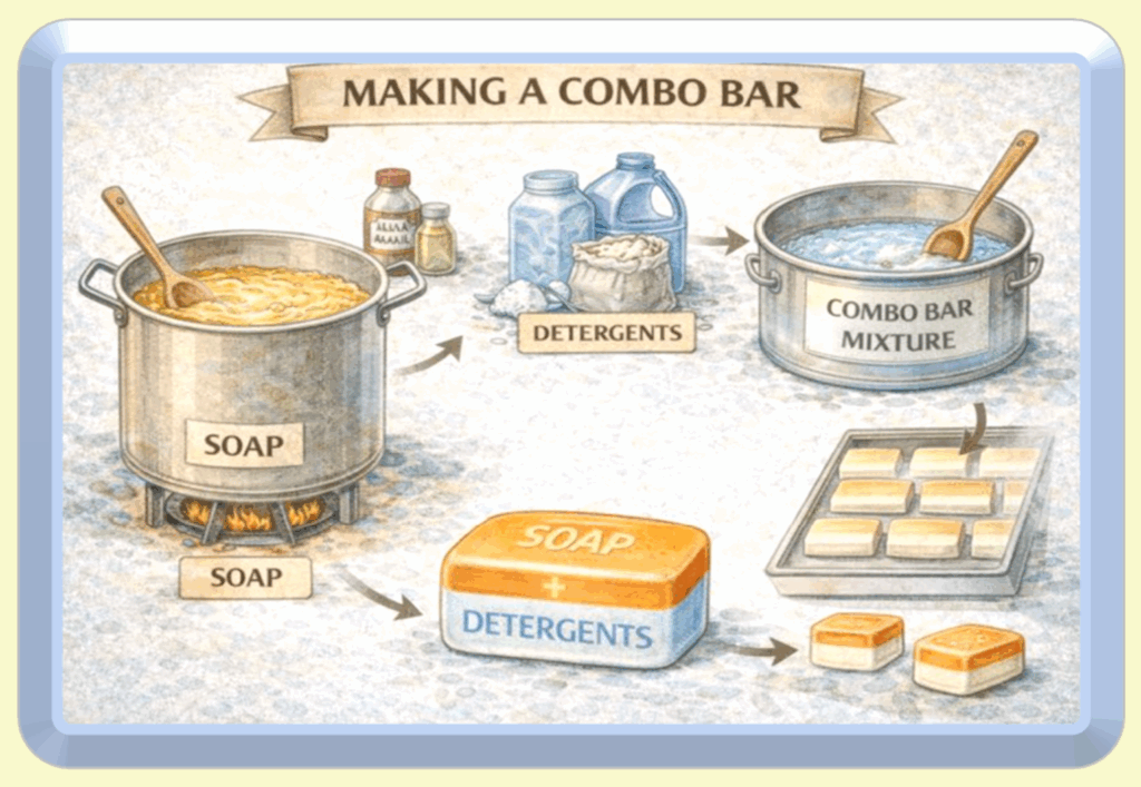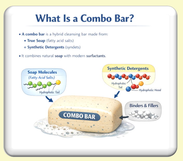 A combo bar is a hybrid cleansing bar in which true soap forms the rigid structural matrix, providing hardness and shape, while synthetic detergents—unable to form a solid bar on their own—are embedded within the soap scaffold to improve performance and consistency.