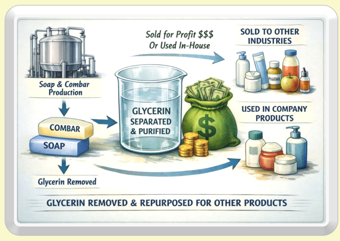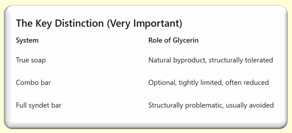 Glycerin’s role follows this same structural logic. In true soap, glycerin is naturally compatible with the crystalline matrix and can remain without destabilizing the bar. In combo bars, glycerin must be carefully controlled to avoid softening and structural imbalance. In full syndet bars, it offers no structural benefit at all and is often reduced or removed entirely.