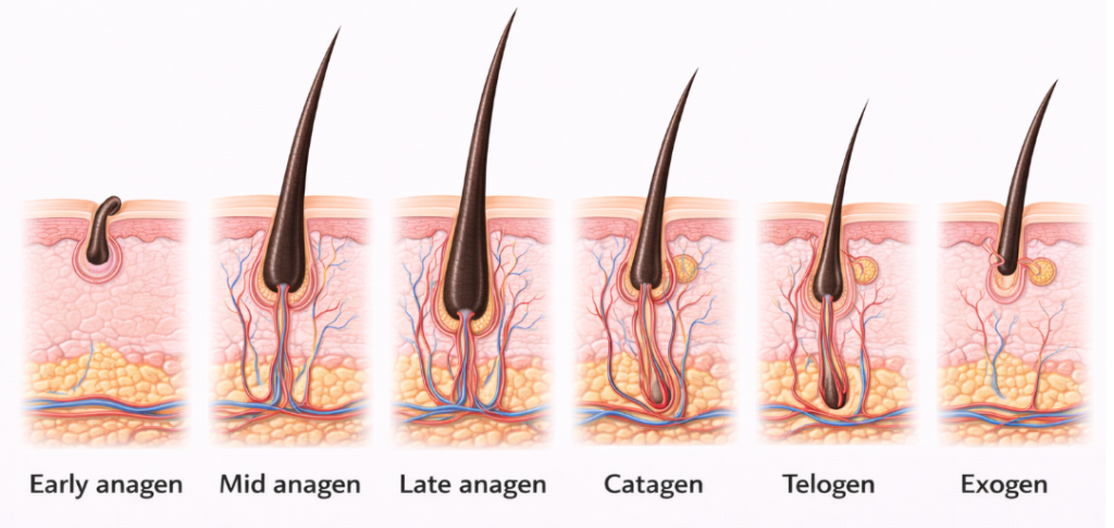 • Catagen Phase: A transitional period when growth slows and follicles prepare for rest.