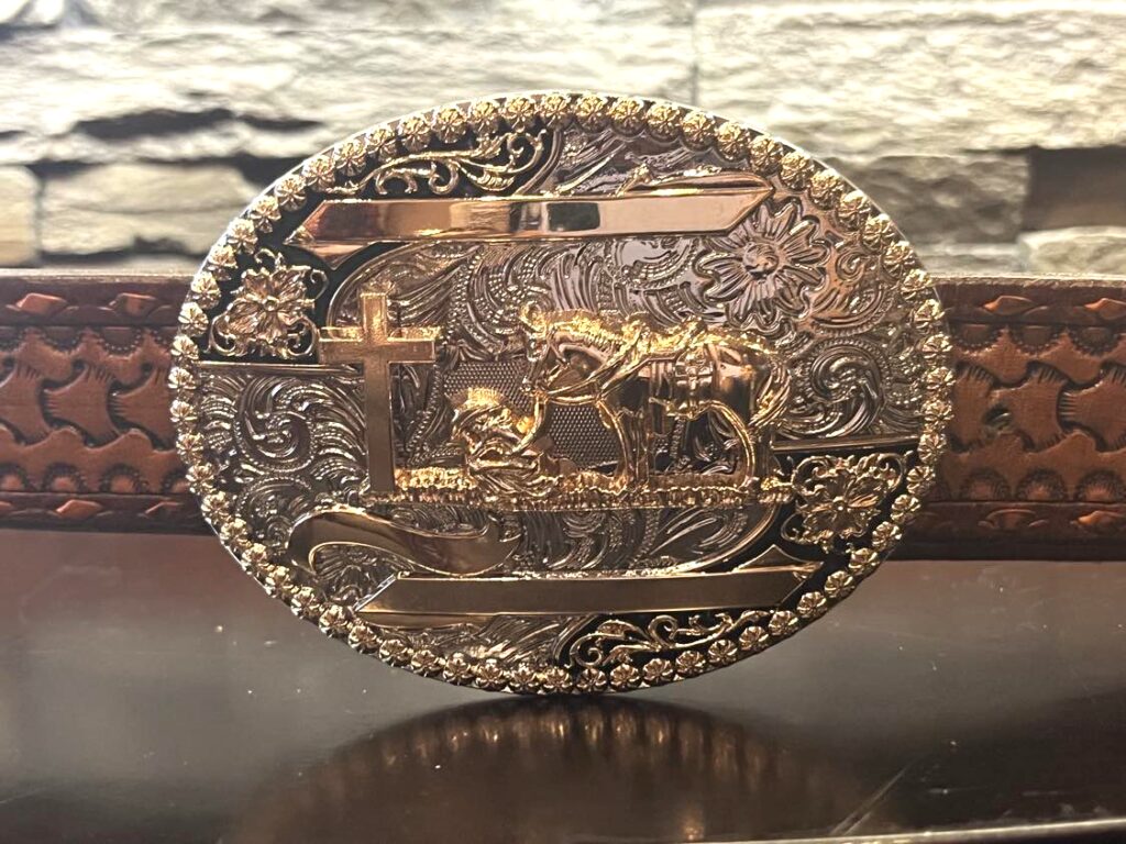 Take a tape measure and measure from the edge of the trophy buckle all around the belt to the end of the billet (referring to the photos below).