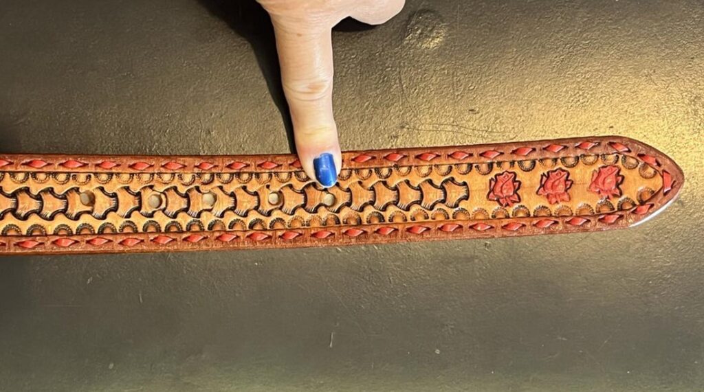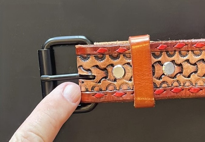 Your belt measurement will be taken from the hole you regularly use, whether it’s the innermost hole, the outermost hole, or any in between (as shown in the photo below), extending to the belt fold (refer to the photo on the right).