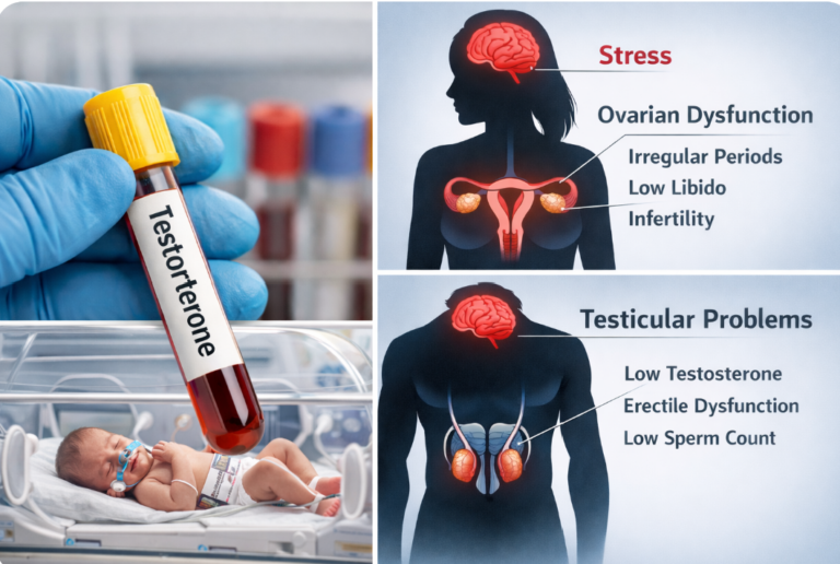 Suppression of testosterone production occurs at the hypothalamic & pituitary level, and in the testes. See section 'Glucocorticoid Action in the Testis' Stress affects the health of the unborn baby; it can affect uterus and ovary functions.