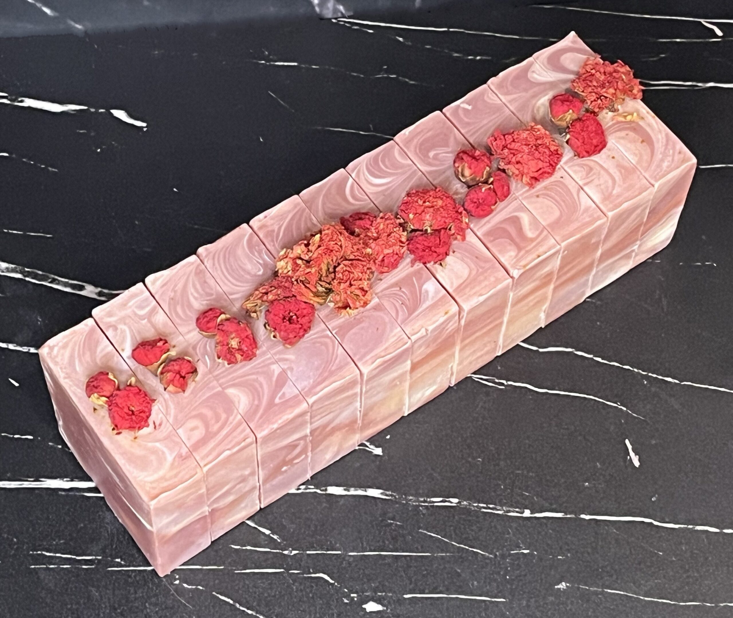After cutting the loaf into bars, I added flowers to the top of each bar and sealed them in heat-sealing bags to keep the soap from drawing moisture from the air and becoming weepy.