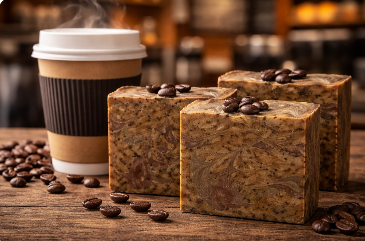 Olive Oil, Stout Coffee, Goat Milk, Coconut Oil, Palm Oil (Responsibly Sourced), Sodium Hydroxide (none remains in the final product), Avocado Oil, Espresso FO, Castor Oil, Mocha Java FO, Sodium Lactate (Liquid Salt), Coffee grounds, Coffee beans (top decoration), EDTA (chelator), & Mica