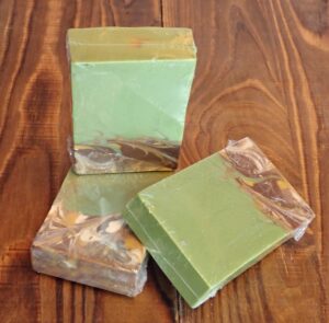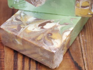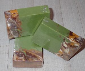 For this design, I used a 2-section loaf mold, dedicating most of it to the green soap batter. In the smaller section, I poured lines of tan, dark brown, and white along the length of the mold. Once the divider was removed, I used a chopstick to swirl the three colors into the green just a bit, ensuring the multi-colored section didn’t swirl too far into the green.