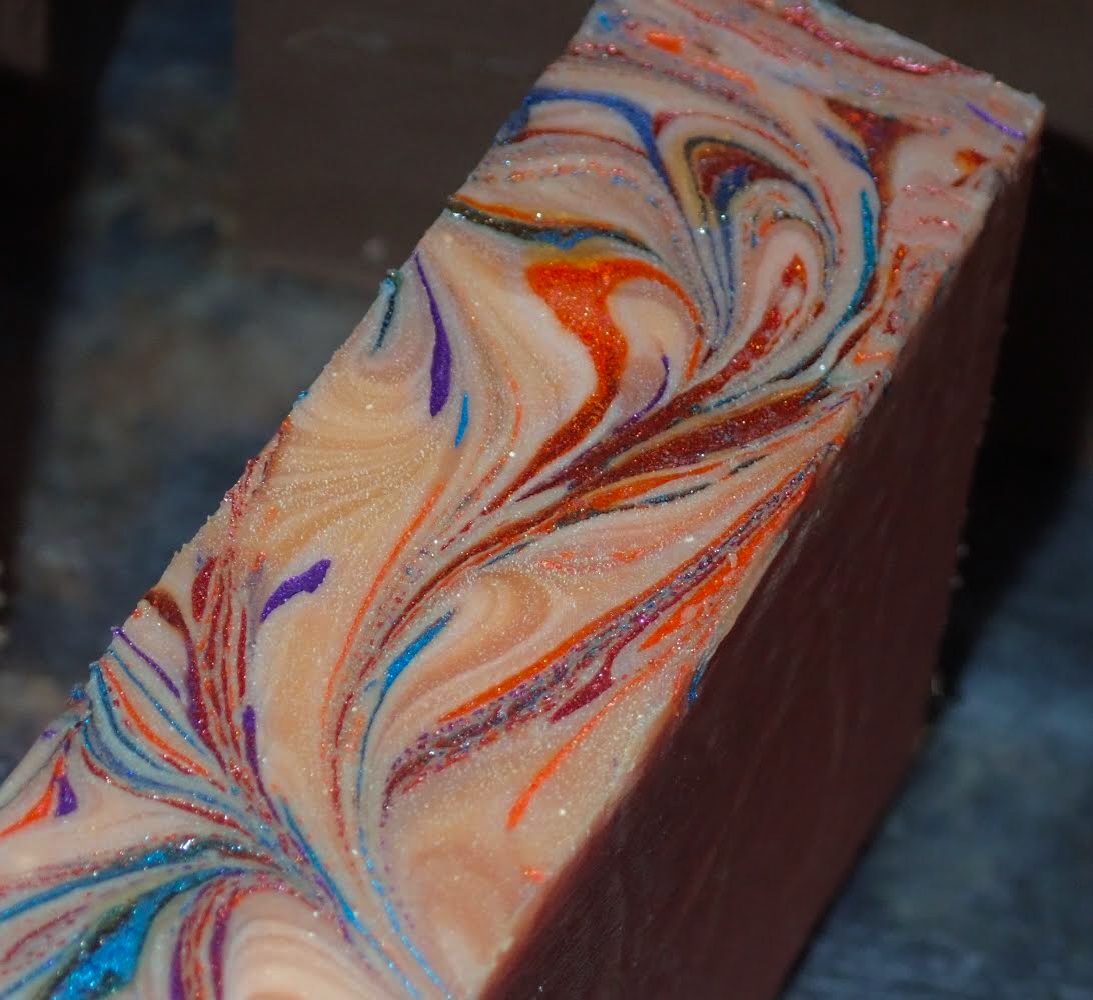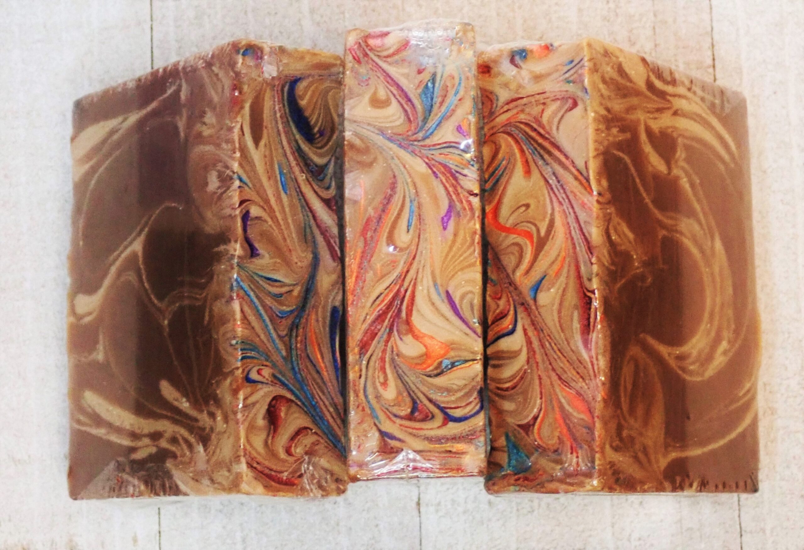 After pouring most of the medium brown mixture into the mold, I alternated pouring the cream color and medium brown soap batter until all was used. I didn’t use a hanger tool for additional swirling, and I’m glad I didn’t—it turned out perfect! For the top, I mixed some colorful micas and drizzled them on, using a chopstick to create swirls without going too deep into the soap.