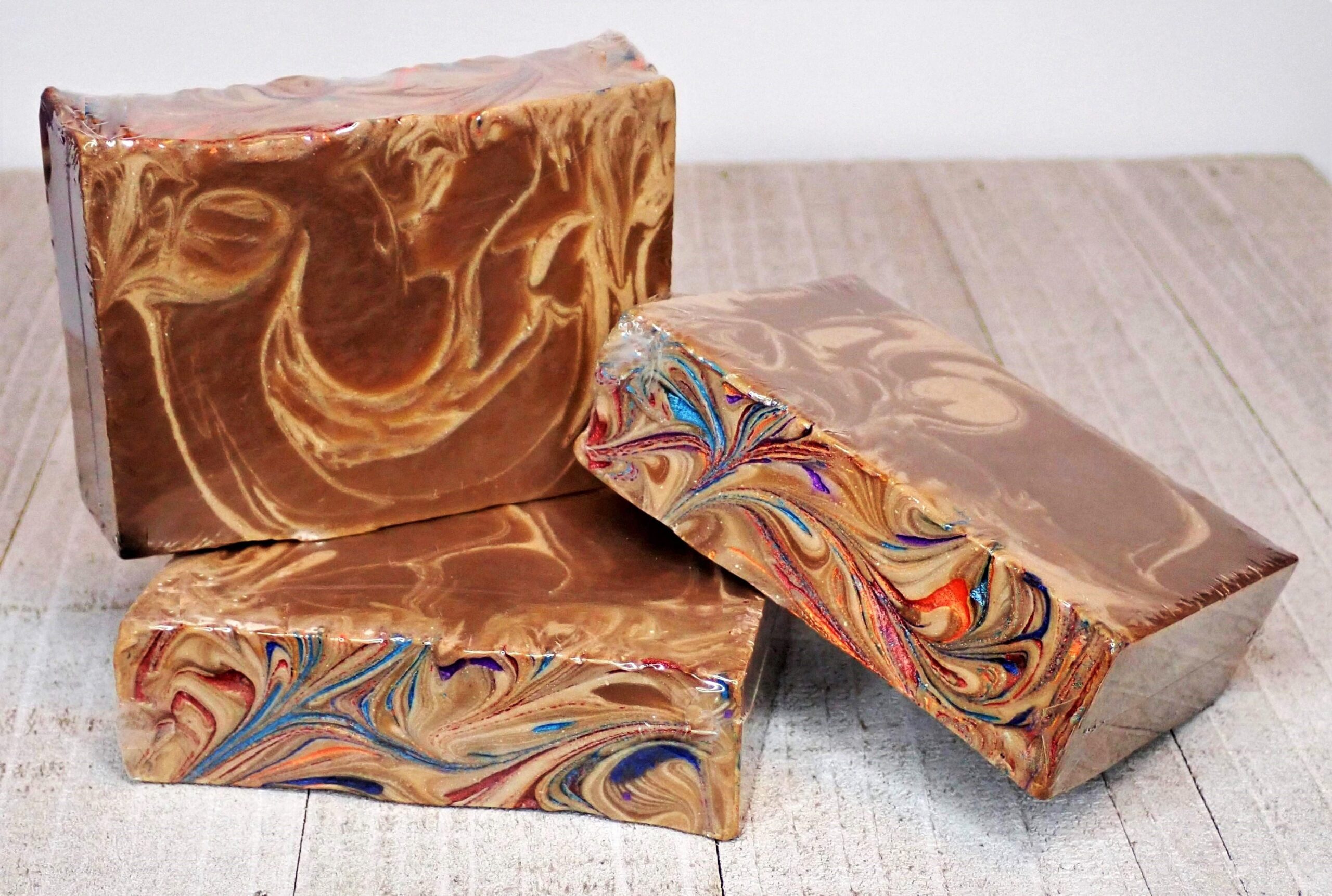 I chose a medium brown for this soap, knowing the fragrance oil (FO) would discolor it to brown, and used a white mica to lighten a small part of the soap mixture. Interestingly, the FO was orange—a first for me, as my previous FOs have been clear.