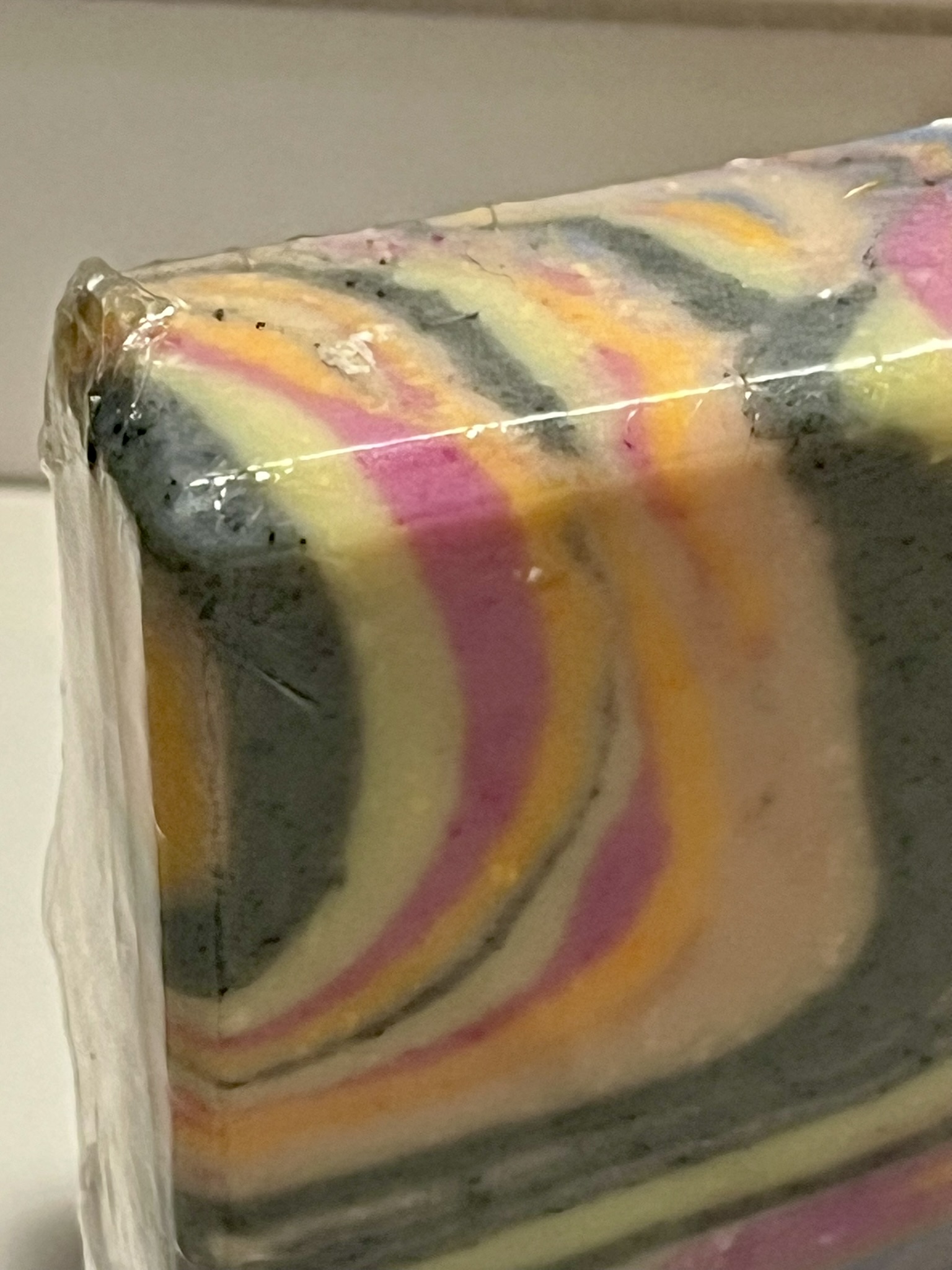 This was my first attempt, and for a first try, I was pleased with the final product. I was so happy with the result that I made two more batches, each with different colors. For this soap, I chose White Peach Prosecco FO and named it Peach Wine—too much wine can make one walk crooked, just like these swirled lines of color 😊