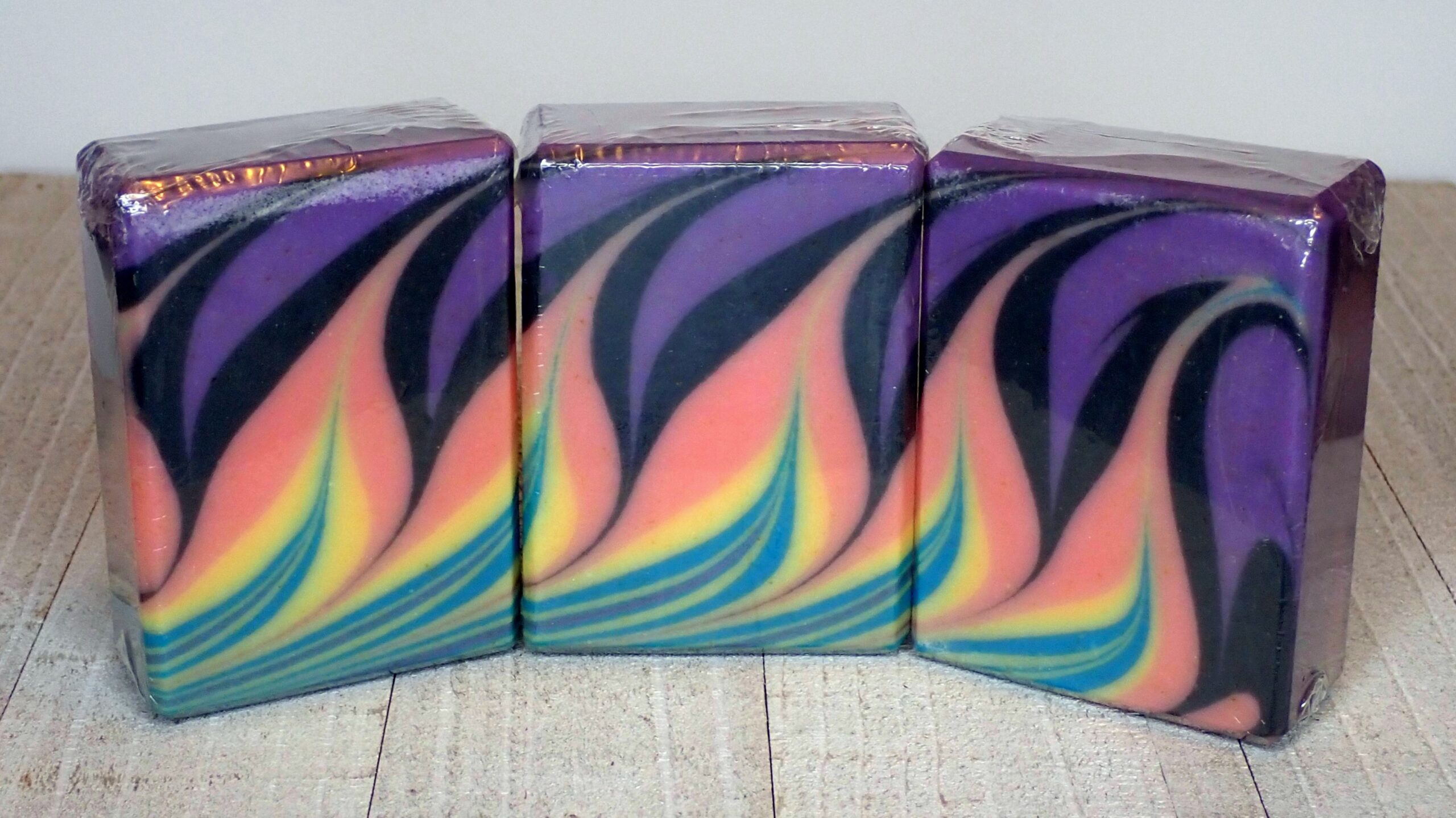 I had no idea this could be done without dividers. I had already made a few loaves using this design, but with dividers. This challenge pushed me out of my comfort zone, and I realized it could indeed be done freehand. The soap batter has to be just right: not too thick and not too thin. If it’s too thick, the batter becomes too stiff to complete the design; if it’s too thin, the colors become muddy, and the design won’t be as crisp. Dividers make this technique less dependent on achieving the ‘perfect’ consistency of the batter.