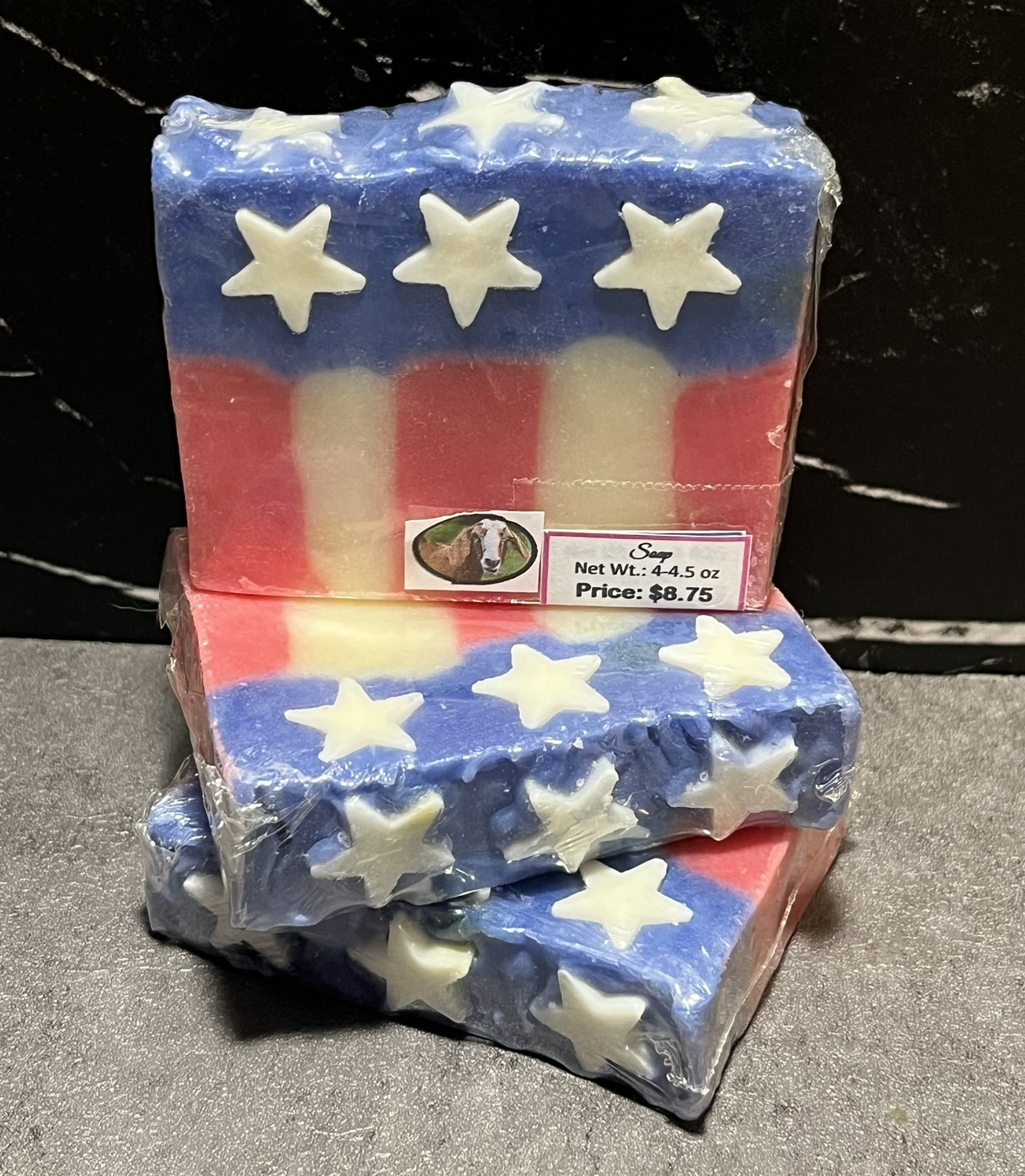 After pouring the red and white sections partway up the mold, I removed the cardboard dividers and filled the remaining space with blue to cover the stripes. The stars you see were made with my own recipe for glycerin soap (also known as melt-and-pour soap).