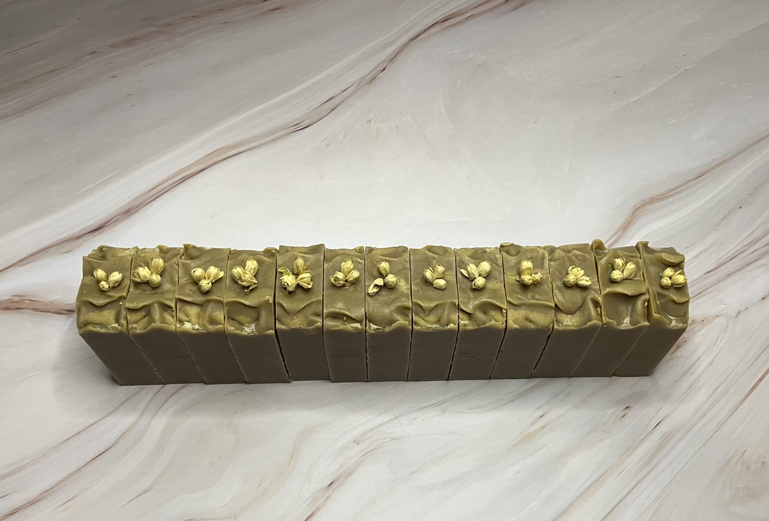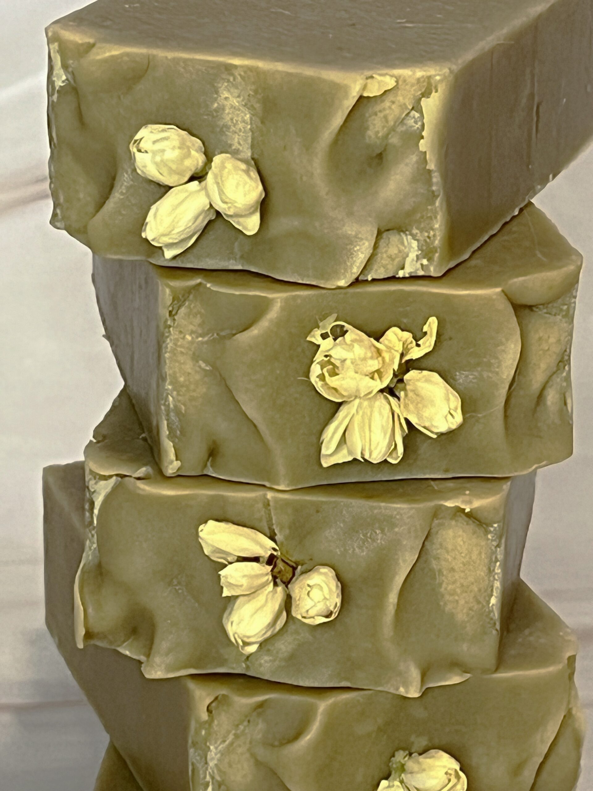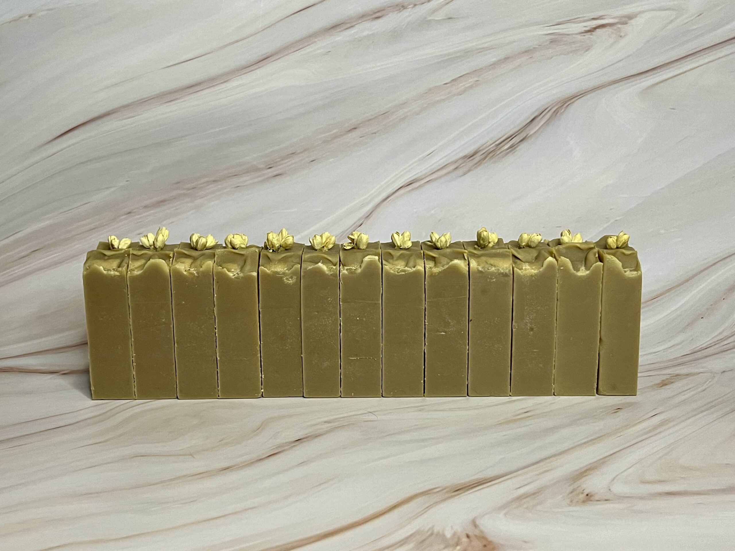 As harsh as saponification (the chemical reaction that creates soap) can be, dried flowers usually turn brown when placed on top of the soap batter right after it’s poured. Therefore, I decided to take a different route. I placed the dried jasmine flowers AFTER saponification was complete, keeping them pristine.