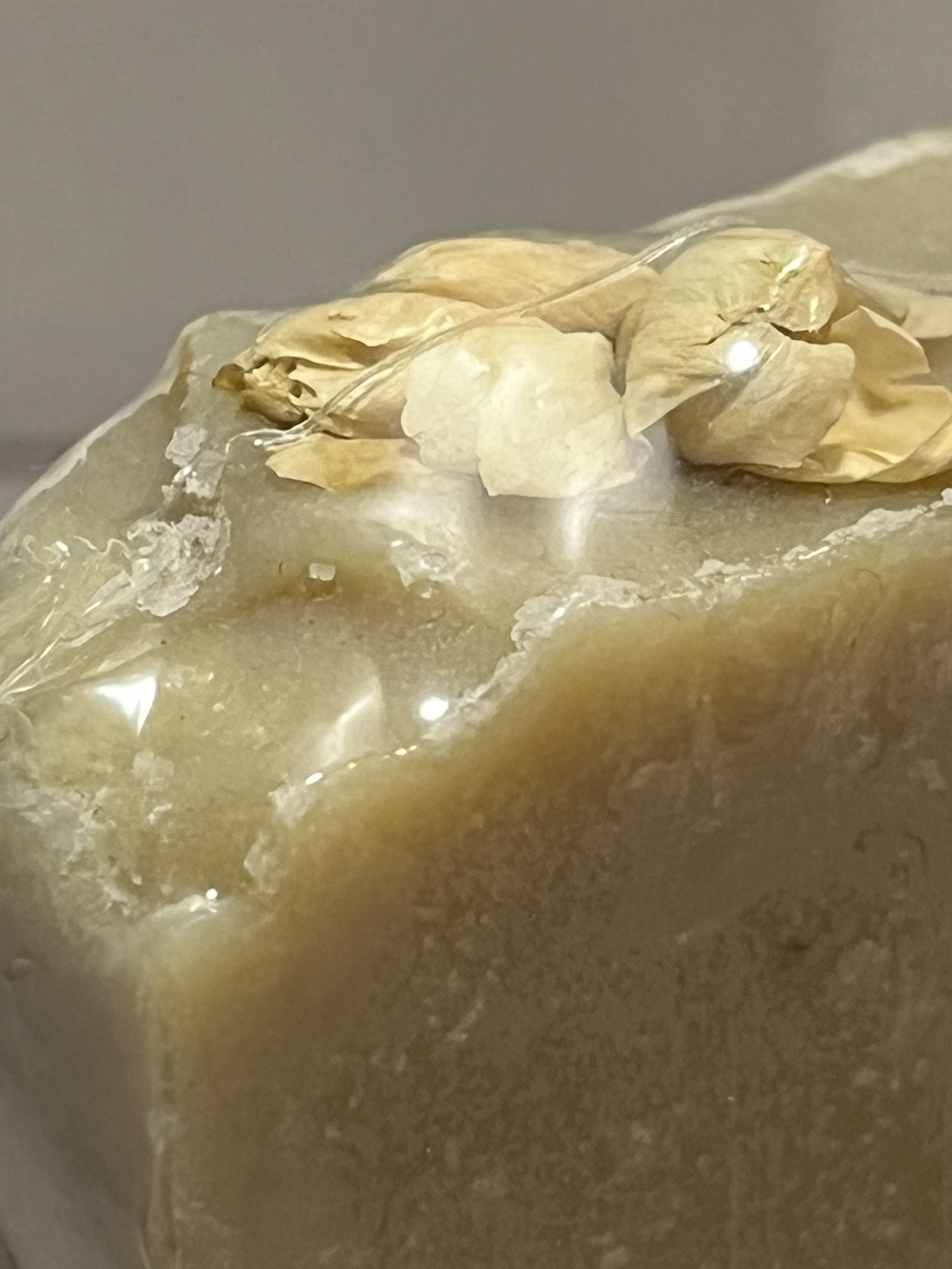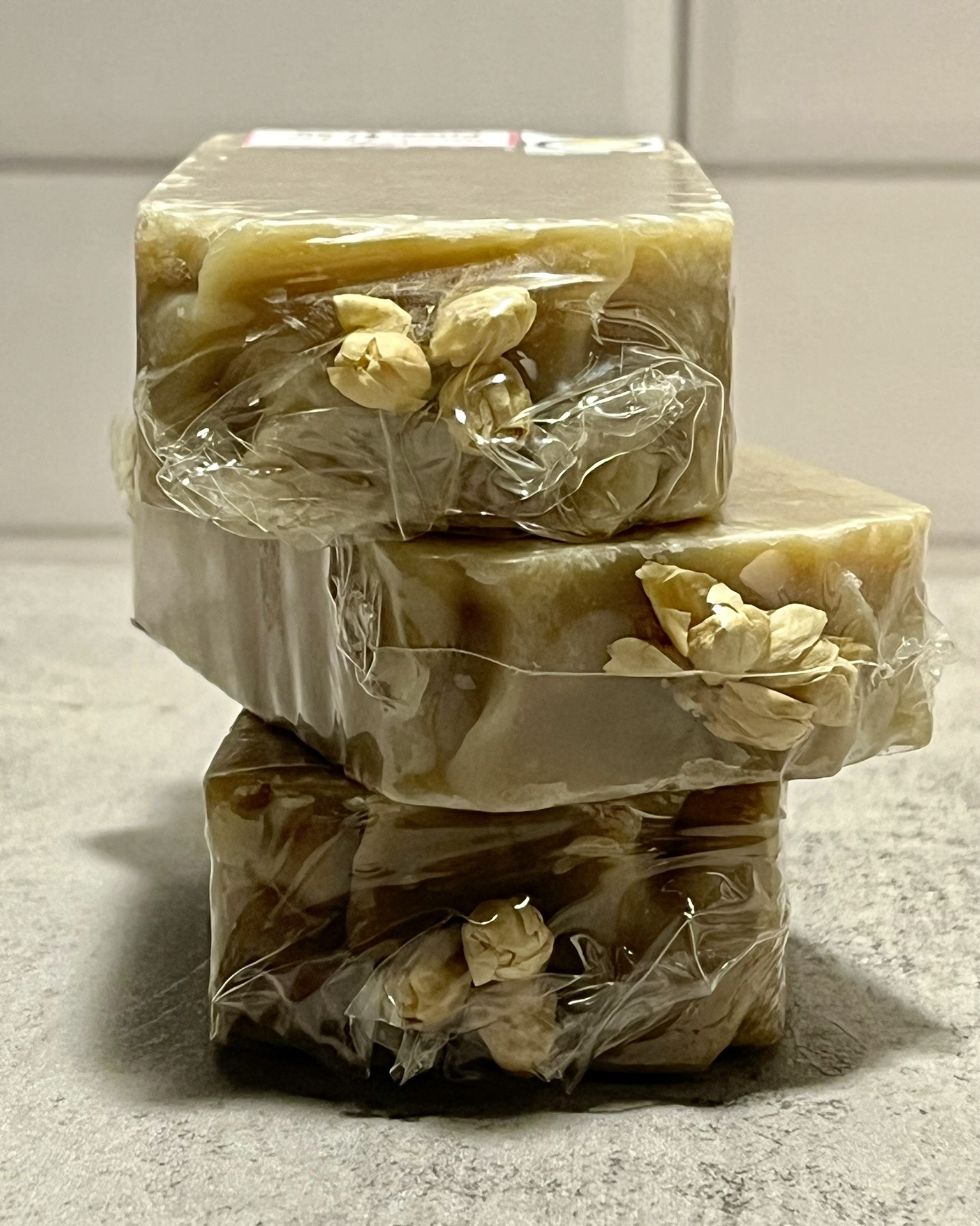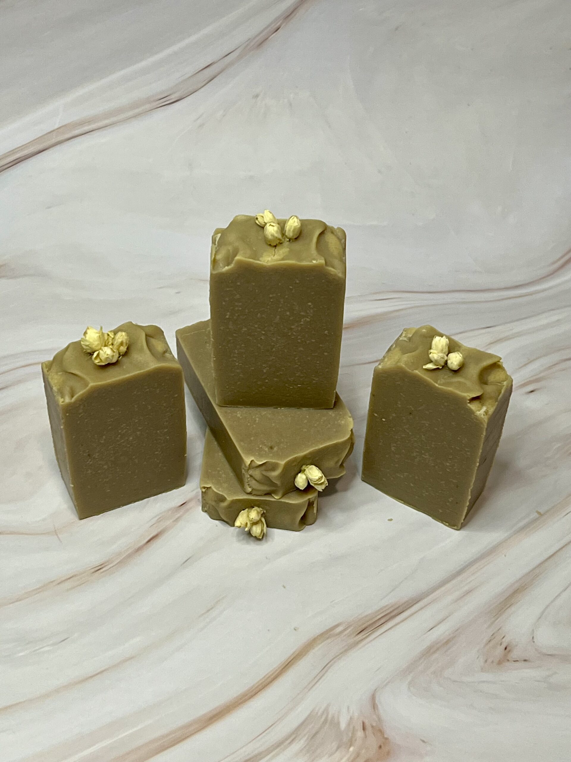 As harsh as saponification (the chemical reaction that creates soap) can be, dried flowers usually turn brown when placed on top of the soap batter right after it’s poured. Therefore, I decided to take a different route. I placed the dried jasmine flowers AFTER saponification was complete, keeping them pristine.