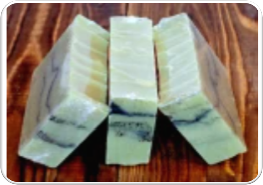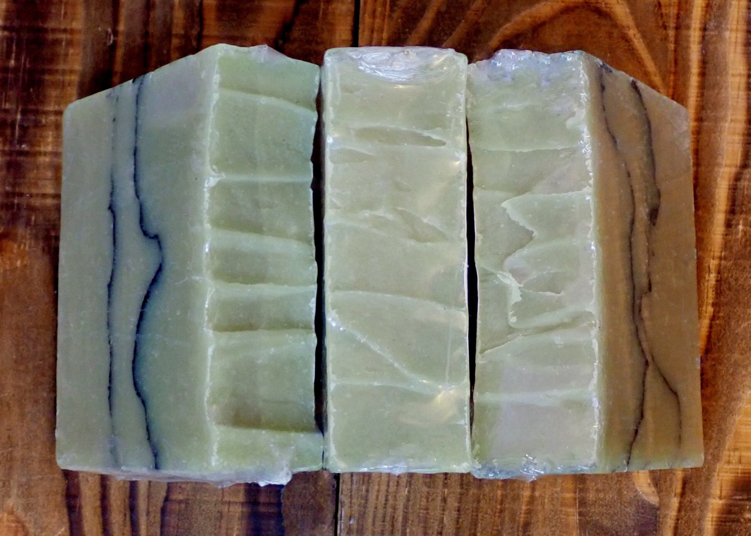 For this soap, I used a three-layer technique with green soap batter. After allowing the first layer to set just enough, I used a spoon to create rough, wave-like textures and sprinkled Brazilian Black Clay over it. I repeated this process until all the batter was used, then textured the top with the spoon to complete the wave effect.