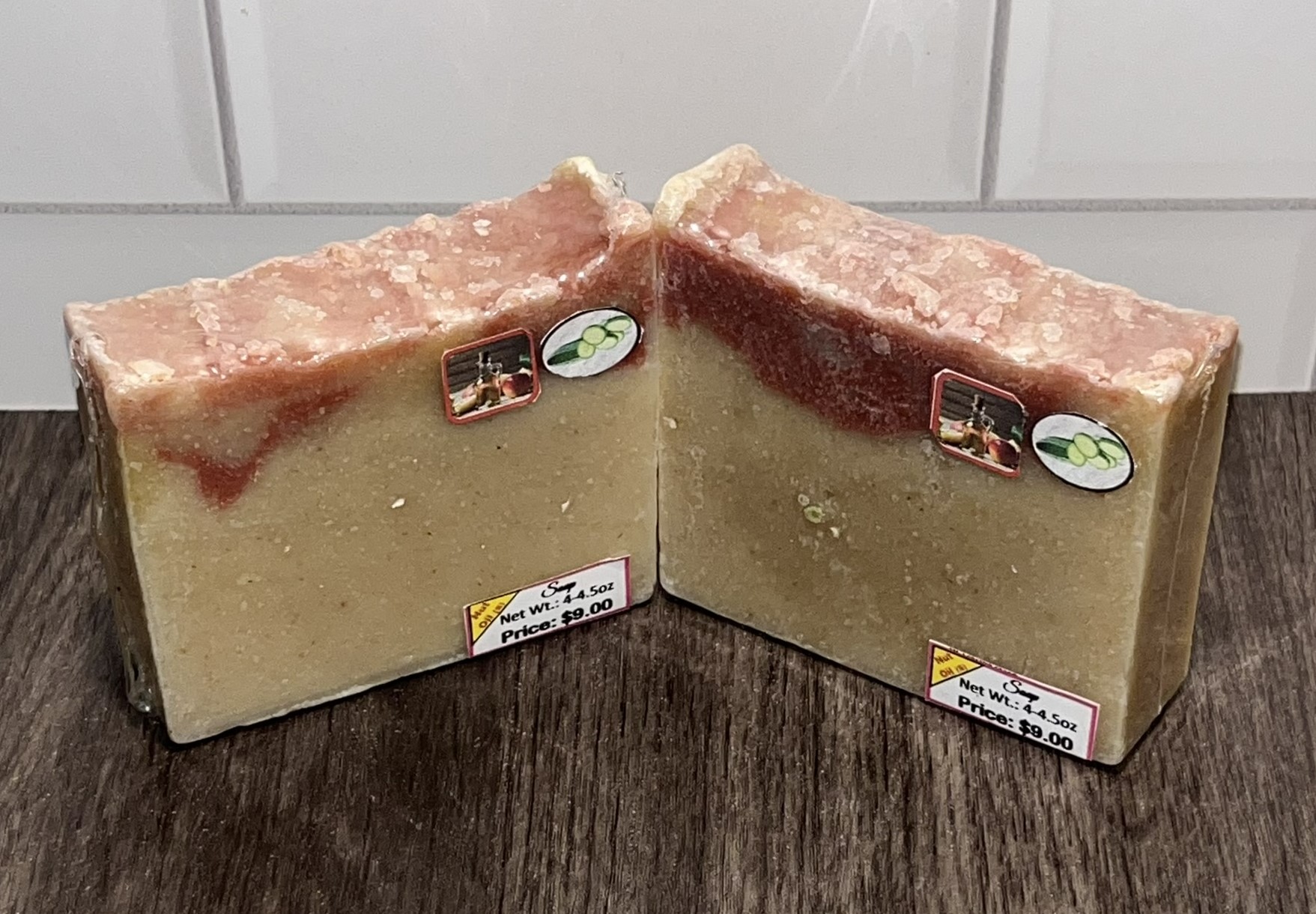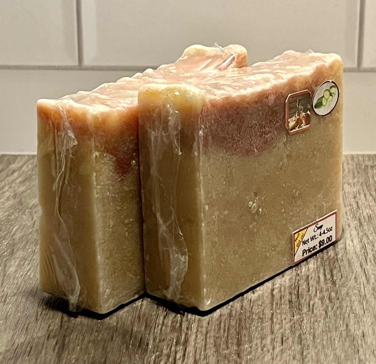 Fresh Juiced Cucumbers, ACV, Avocado Oil, Cocoa Butter, Coconut Oil, Palm Oil, (Responsibly Sourced), Buttermilk, Sodium Hydroxide (none remains in the final product), Lard, Canola Oil (High Oleic), Castor Oil, Hazelnut Oil, Macadamia Nut Oil, Palm Kernel Flakes, Plumeria FO, Ground Oatmeal, Sodium Lactate (Liquid Salt), European Green Clay, Moroccan Red Clay, Silk (Cruelty Free), & Micas
