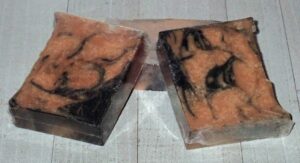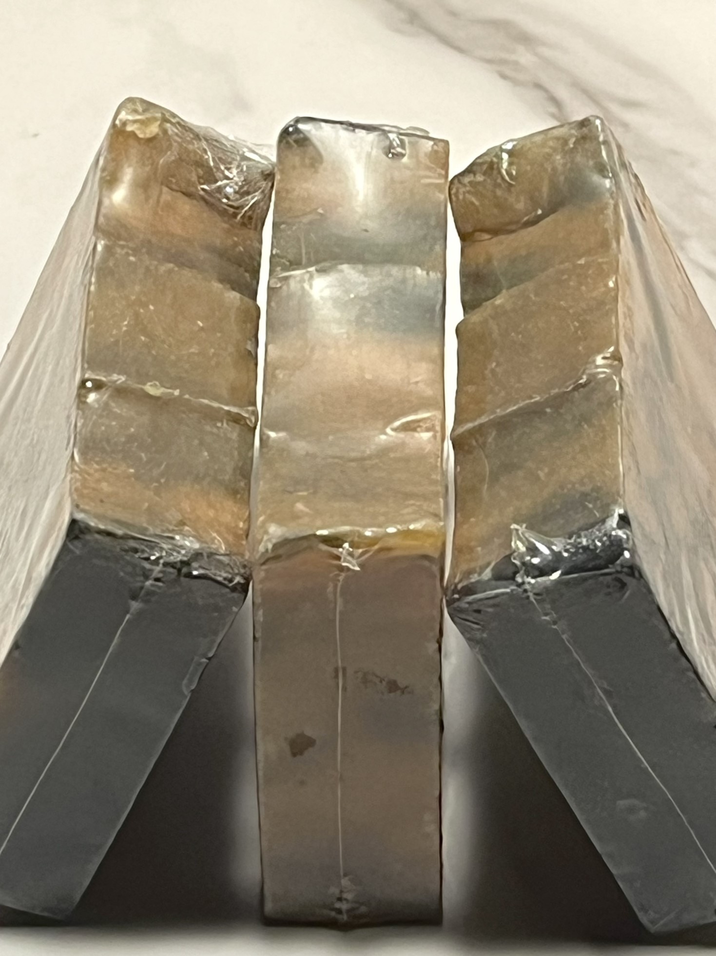 The result is a visually striking contrast between the main batter and the activated charcoal batter. As expected, the vibrant colors from the tomato paste and Moroccan clay faded over time. While many soapers enjoy using foods and infused oils for coloring, these often mellow into softer, muted tones. Personally, I prefer the lasting boldness of skin-safe oxides and micas for my designs.