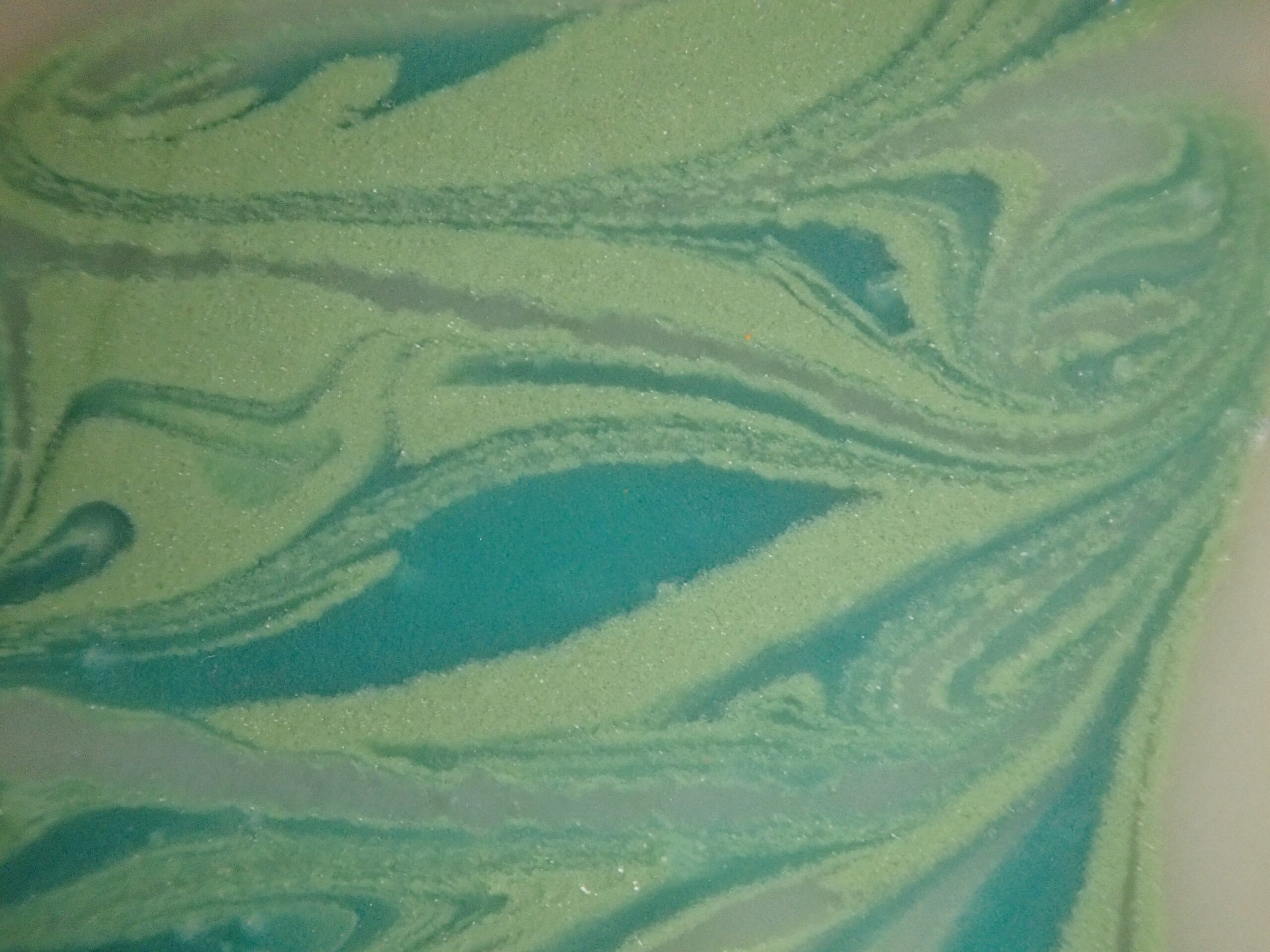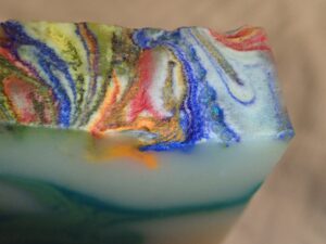 Since the tree was upside down in the mold, the bottom of the mold would actually be the top of the soap once cut. In all my careful planning of colors and technique, I completely forgot one small detail—I didn’t plan to decorate the top! And this, my friends, is where the Polish joke to myself comes in. 😊