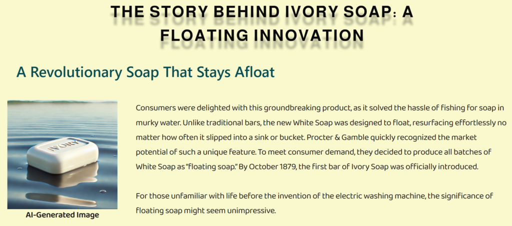 One of P&G’s most iconic products, Ivory Soap, became famous for its unique ability to float. Legend has it that this characteristic was discovered accidentally in the late 19th century when a worker forgot to turn off a soap-mixing machine, allowing air to be whipped into the batch. The resulting soap bars, lighter and more buoyant, were marketed as a product that wouldn’t sink in water—a practical advantage that resonated with consumers and contributed to Ivory Soap’s enduring popularity. This unexpected innovation not only set the product apart but also reinforced its branding as a pure, gentle soap, solidifying its place in American households for generations.
