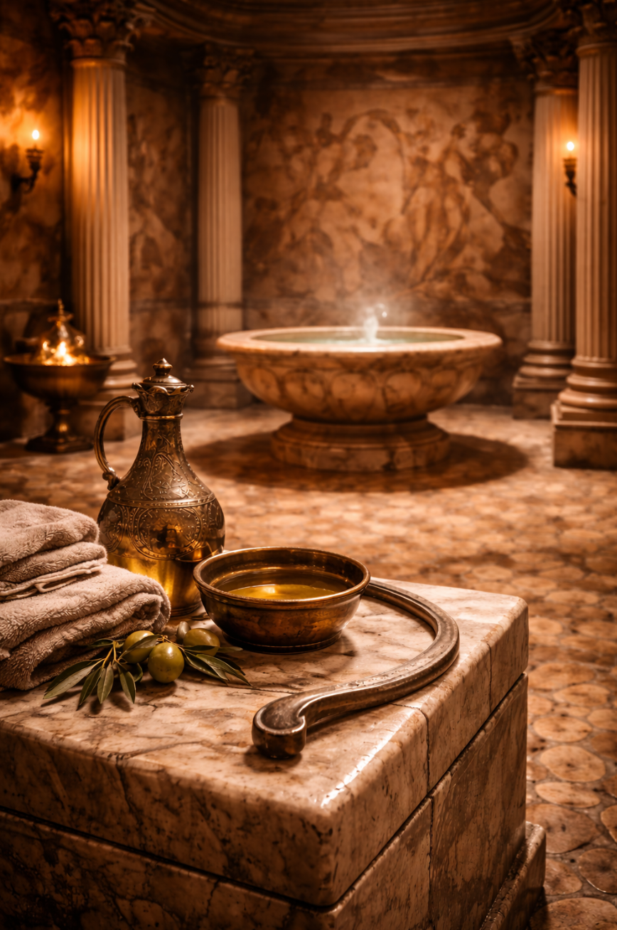 Bathers would begin in the tepidarium, a warm room where they acclimated to the heat. Here, they applied oils—often scented—to their skin in a ritual known as anointing. The oil served to loosen dirt and sweat, preparing the skin for deeper cleansing. (After all, like dissolves like, so oil effectively removed oily sweat and dirt from the skin.)