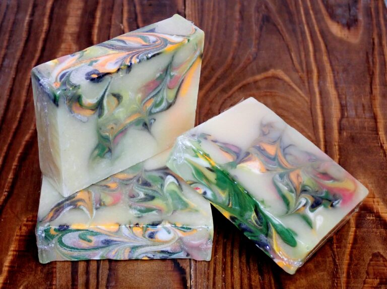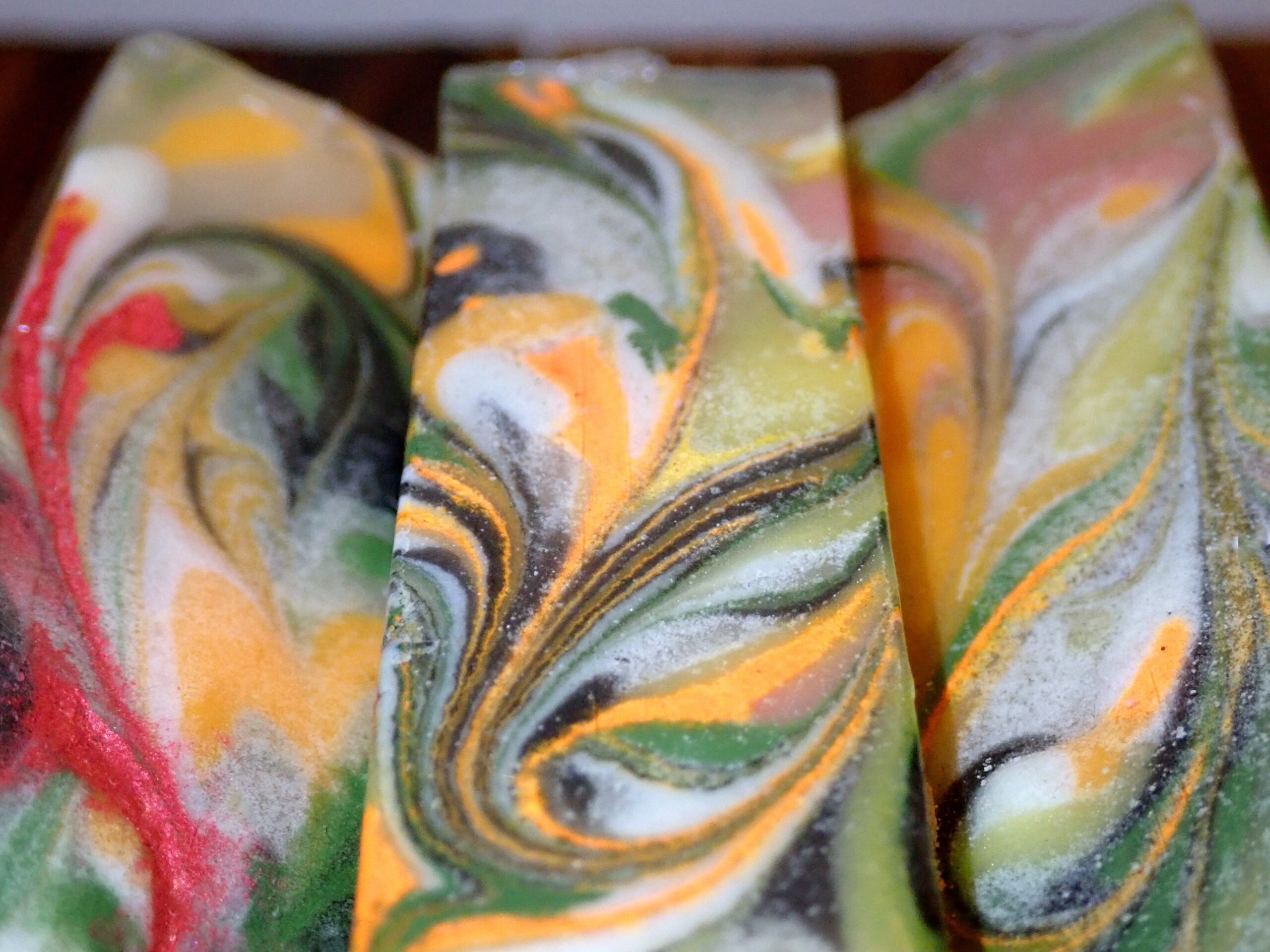 I absolutely love the vibrant colors in this wild soap! Crafted using the drop swirl technique, I began by pouring a cream-colored base into the mold. Then, from varying heights, I dropped different colors of soap batter into the base, creating unique depths and effects. Once all the colors were added, I used a hanger tool to swirl them together, forming intricate patterns.