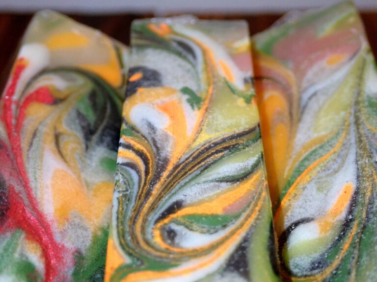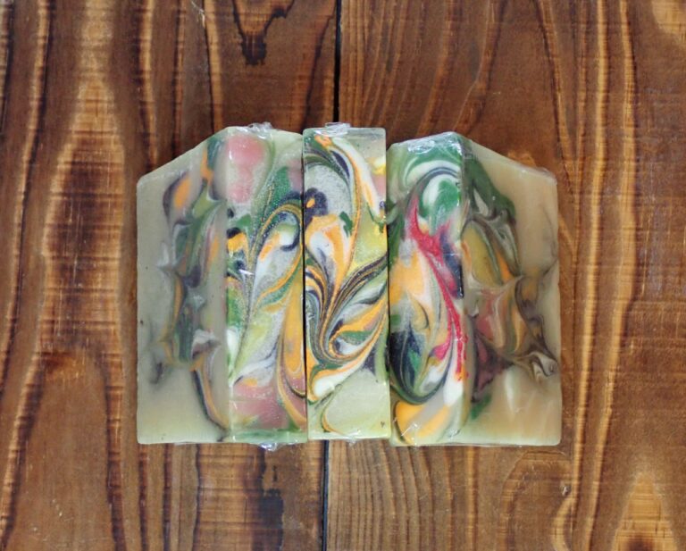 I didn’t have a name in mind until I saw the final cut bars. Inspired by the delicate webs of spiders that I often admire while camping or relaxing outdoors, I was struck by how the wispy lines and intricate webbing in this soap mirrored their artistry. And so, Charlette’s Web was born. Originally, I considered Charlette’s Web in Color, but I decided a more streamlined name suited it best.